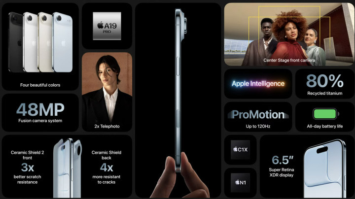 این گوشی از نظر فناوری صفحهنمایش، اندازه، عمر باتری و امکانات، بین آیفون 17 و 17 پرو مکس قرار میگیرد – تراشه و مودم پیشرفته دارد، اما سیستم خنککننده بخار ندارد. باتری آن کمتر از آیفون 17 دوام میآورد و از همان فناوری نمایشگر بهره میبرد.