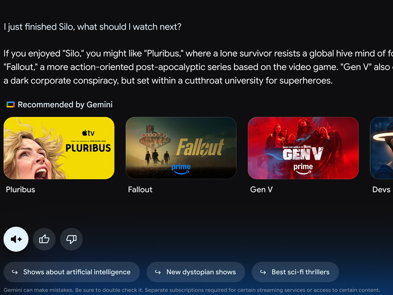 Gemini برای Google TV که برای تجربههای صفحهنمایش بزرگ طراحی شده است، به کاربران اجازه میدهد با تلویزیون خود صحبت کنند تا چیزی برای تماشا پیدا کنند، با دریافت خلاصه داستان، قسمتهای قبلی یک سریال محبوب را مرور کنند یا پیشنهادهایی دریافت کنند؛ آن هم تنها با استفاده از مکالمه طبیعی. برای مثال، میتوانید از Gemini بخواهید چیزی را پیشنهاد دهد که ترکیبی از سلیقه دو نفر باشد، یا در بهخاطر آوردن نام یک سریال یا فیلم کمک بگیرید؛ حتی اگر عنوان آن را به یاد ندارید اما میتوانید داستان یا نام یکی از بازیگرانش را توصیف کنید.